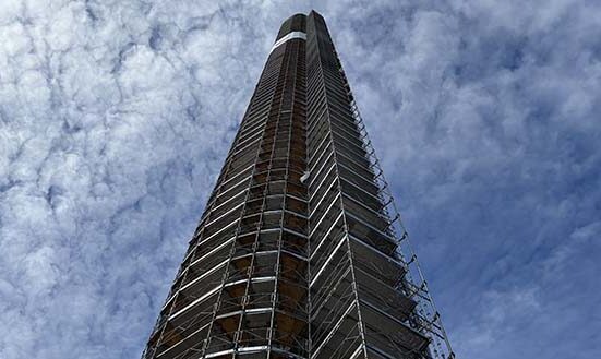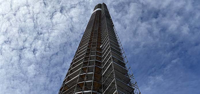 Sveriges högsta byggställning när Käppalaförbundet renoverar skorsten med kolfiberteknik